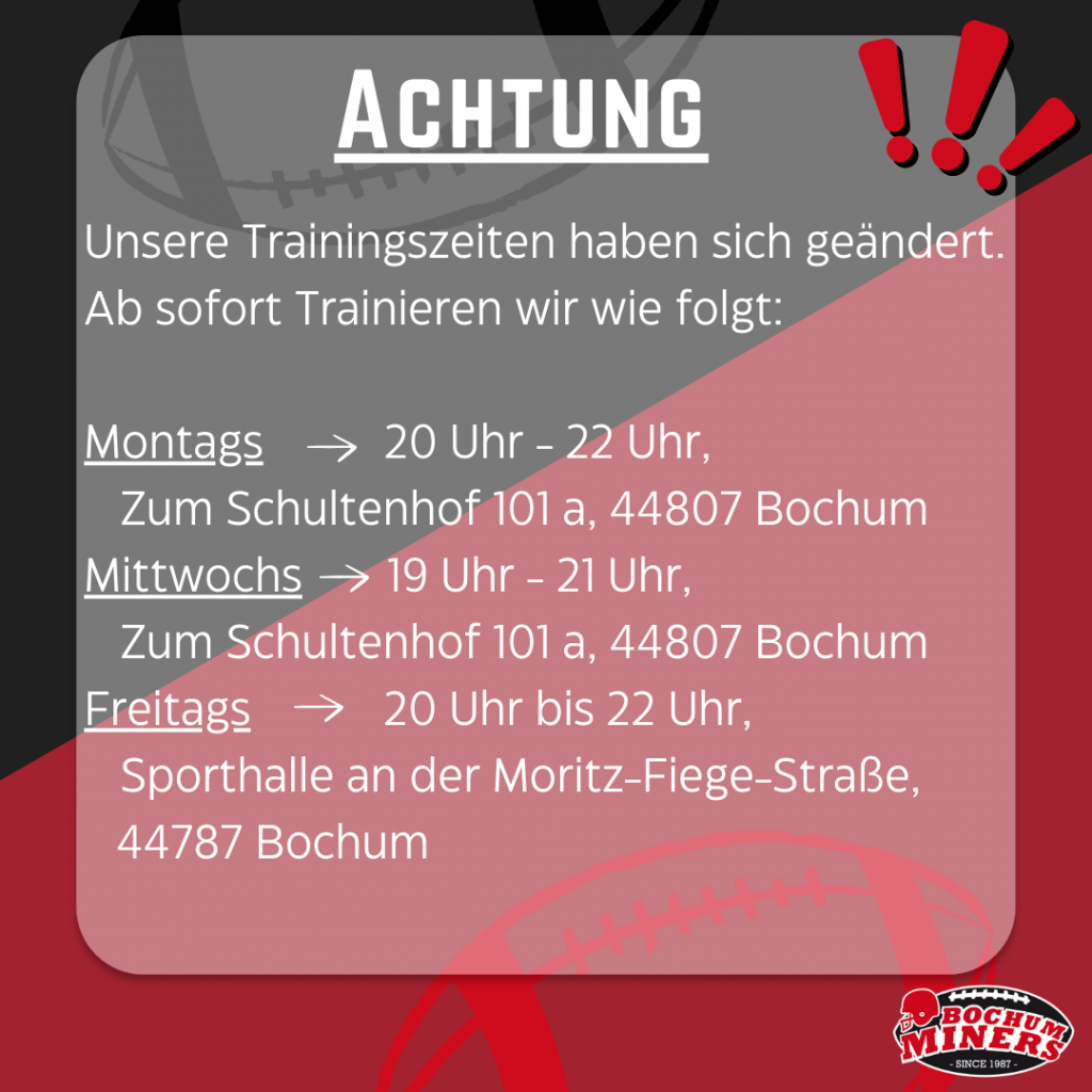 Achtung, Achtung! für das neue Jahr haben wir unsere Trainingszeiten angepasst. Ab sofort trainieren wir wie folgt: Montags: 20 Uhr – 22 Uhr; Zum Schultenhof 101 a, 44807 BochumMittwochs: 19 Uhr – 21 Uhr; Zum Schultenhof 101 a, 44807 BochumFreitags: 20 Uhr bis 22 Uhr; Sporthalle an der Moritz-Fiege-Straße, 44787 Bochum Neue Gesichter sind bei […]